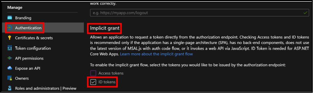 - Under Manage, select Authentication, and check the ID tokens option under the Implicit grant section.