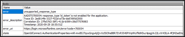 Note the error code begins with AADSTS, meaning you’re hitting the Azure AD service. The app’s authentication provider is not able to return a token that is required for the OAuth2 implicit flow. This flow is a simplified authentication flow, where a successful authentication request will directly result in an access token to be returned to the app.