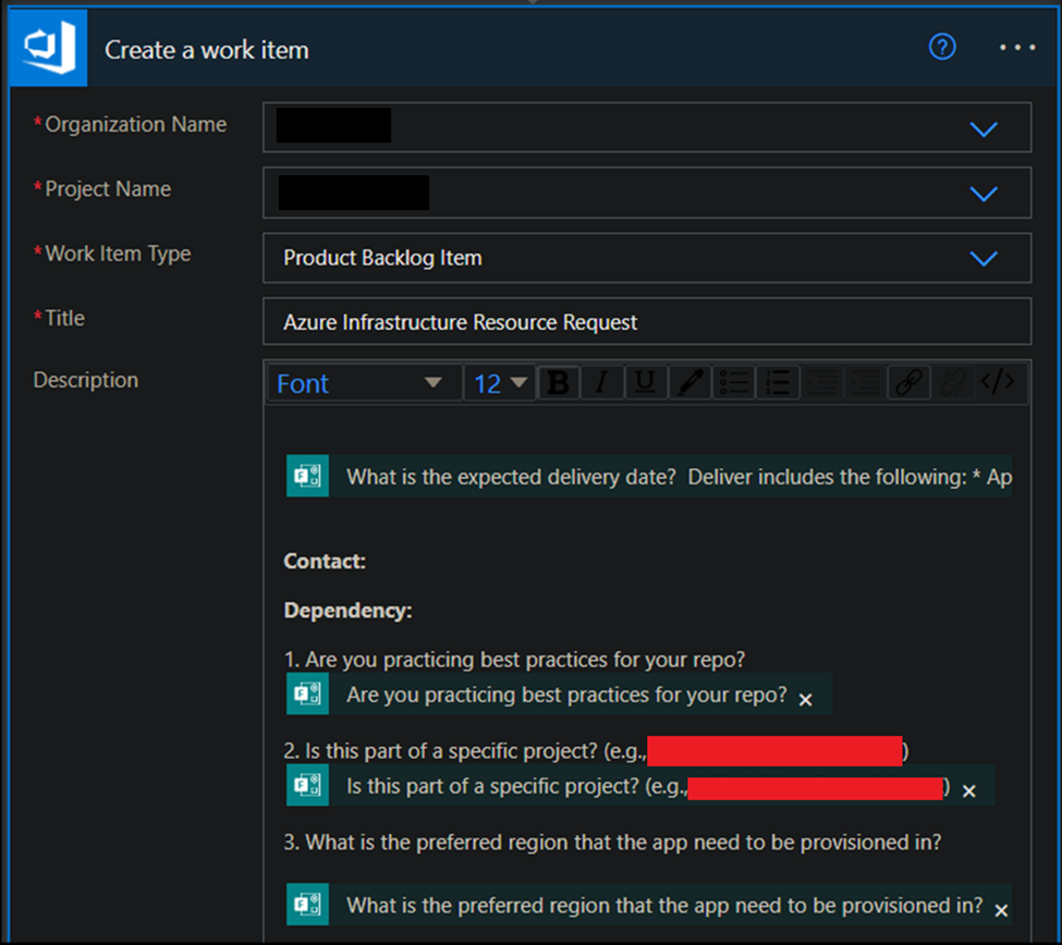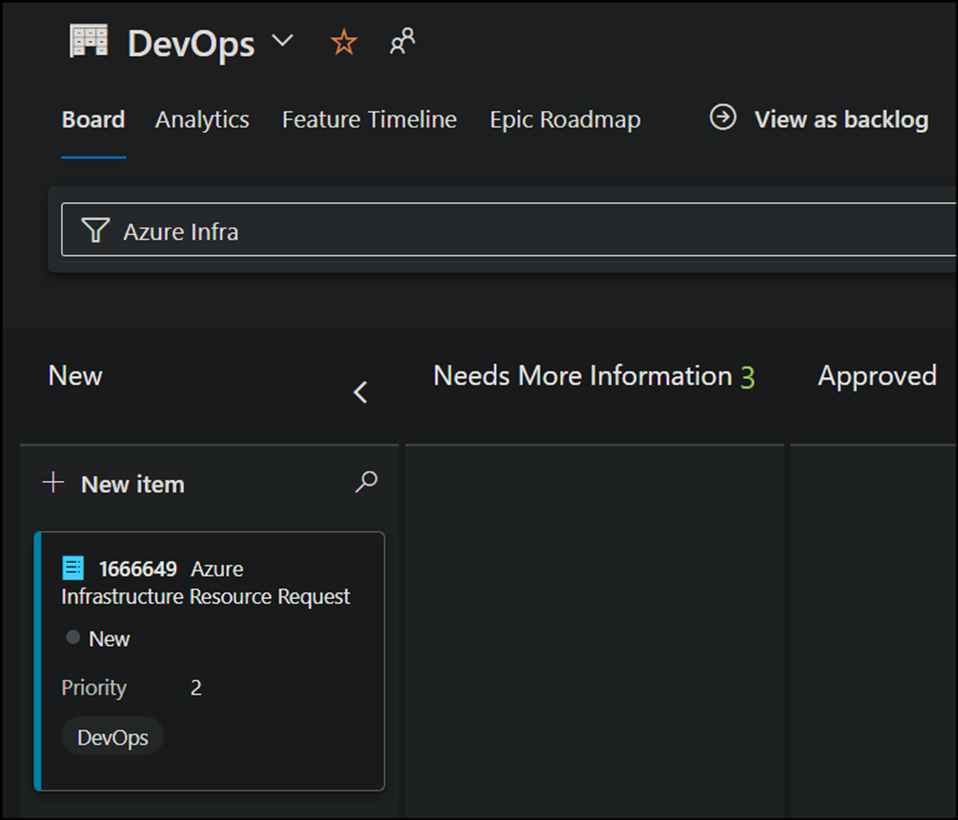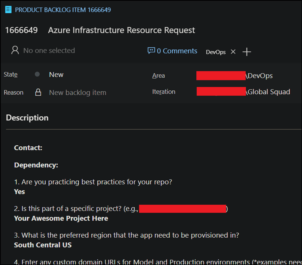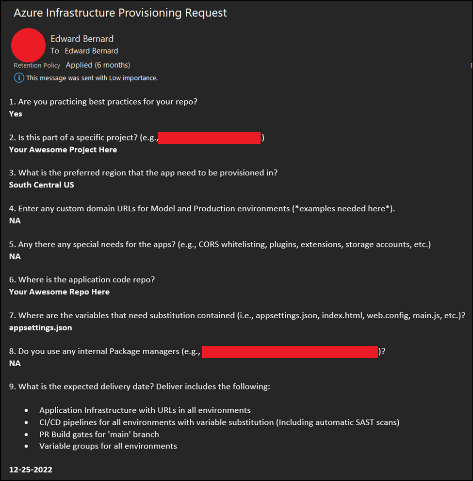 I was having a conversation the other day with a PO (Product Owner) politely warning us about an avalanche of pending requests from various teams coming in for provisioning Azure resources and deploying code to meet new client commitments. Basic information is provided by the dev lead, and the PO will then manually create PBIs in our Azure DevOps board. Next, we review these requests during regular refinement meetings to see if enough information is there for us to work with, schedule and act on accordingly.