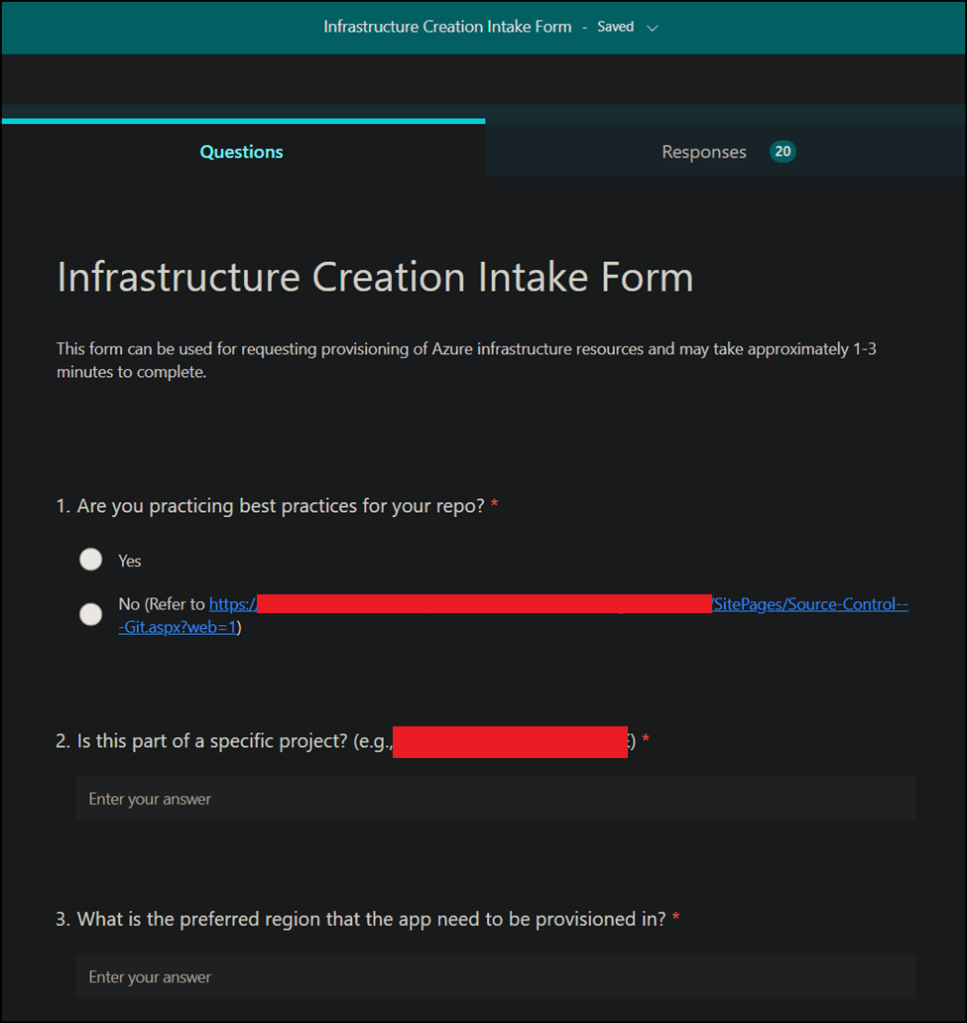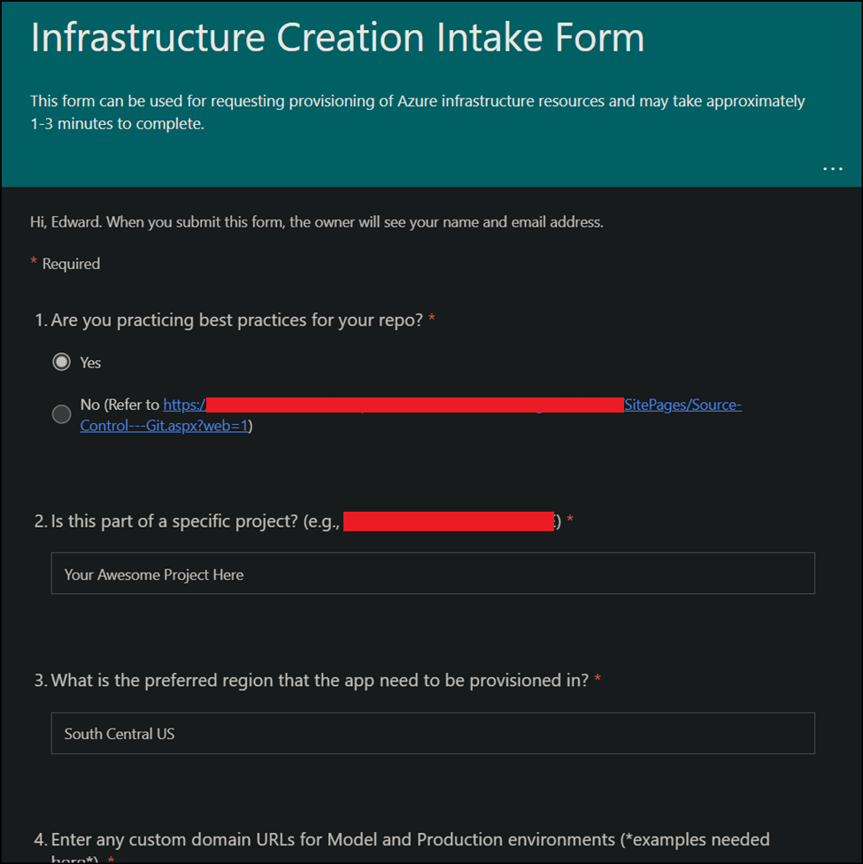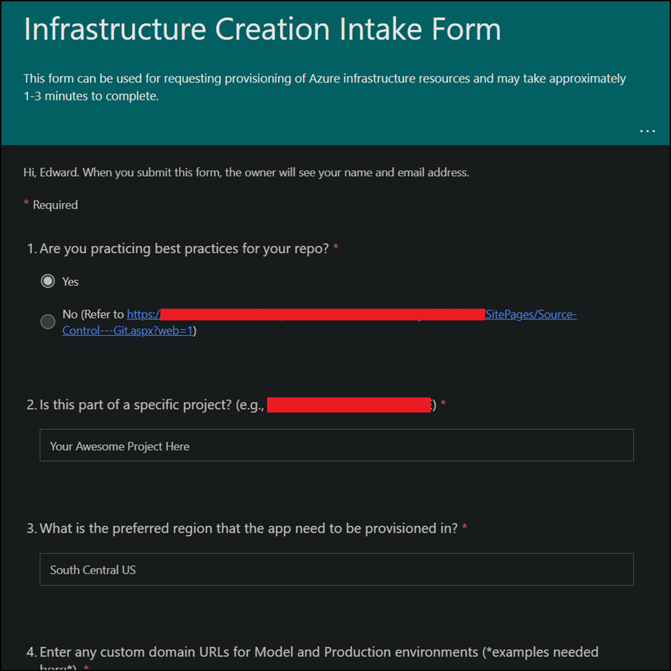 I was having a conversation the other day with a PO (Product Owner) politely warning us about an avalanche of pending requests from various teams coming in for provisioning Azure resources and deploying code to meet new client commitments. Basic information is provided by the dev lead, and the PO will then manually create PBIs in our Azure DevOps board. Next, we review these requests during regular refinement meetings to see if enough information is there for us to work with, schedule and act on accordingly.