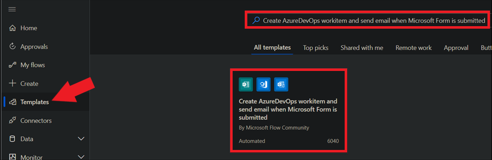 Search for the following template: Create AzureDevOps workitem and send email when Microsoft Form is submitted.