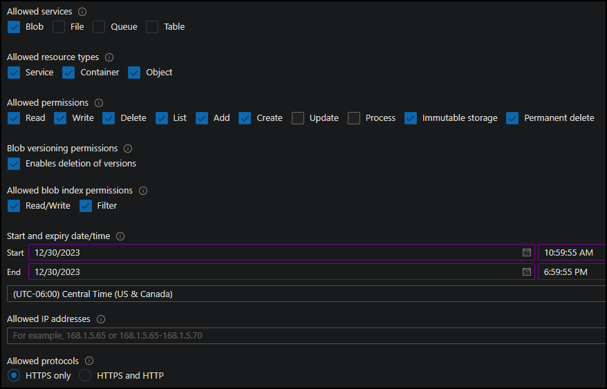 We need to generate a shared access signature key (SAS) that will be used by the pipeline to access the storage account. A shared access signature (SAS) is a URI that grants restricted access rights to Azure Storage resources. You can define options such as permissions, resource type, allowed protocol and a time to live (TTL) which is always recommended for security purposes. More information can be found here.