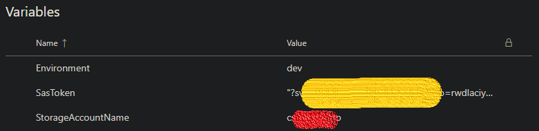 In Azure DevOps, create a new variable group as follows. This will be used by the pipeline during execution. Be sure to enclose the SasToken value in double quotes (” “) and click the padlock icon to obscure the value for an extra layer of security.