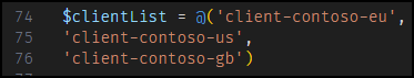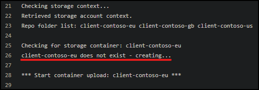 The script compares its list of clients ($clientList) with that of the repo ($folderList). If there is a match between the two, the storage account container is created if it doesn’t exist. Make sure the client list is updated accordingly to match.